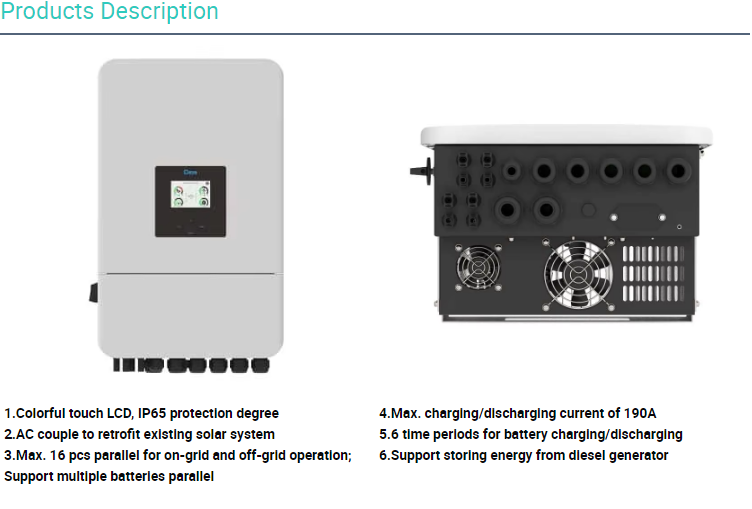 Output Type: Single Inverter Efficiency:97.6% Place of Origin:Anhui, China Model Number:SUN-8K-SG05LP1-EU-SM2 Brand Name:Deye Input Voltage:500V Output Voltage:220/230 0.85Un-1.1Un Output Current:50A